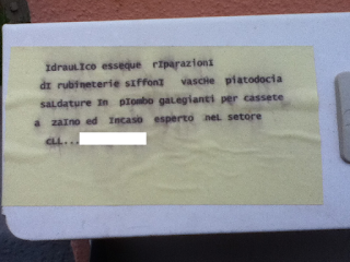 La foto di un bigliettino identico a questo e però scattata altrove è apparsa ieri su una pagina facebook molto più famosa della mia (non che ci voglia molto). Nei commenti molte persone ne mettevano in dubbio l'autenticità. Io vorrei, davvero, che avessero ragione loro.